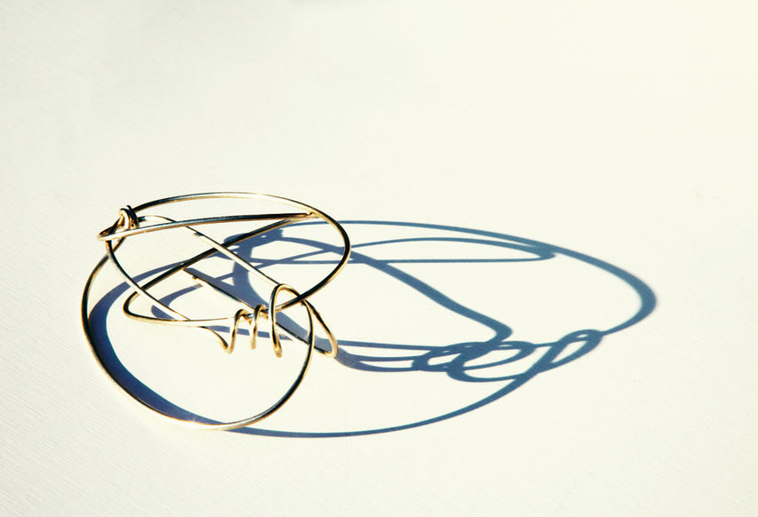 Fil d'or, d'argent ou de titane mise en forme à la main, dans l'espace, comme un dessin d'enfants en 3D, la paire est constituée de 2 volumes similaires mais jamais identiques.